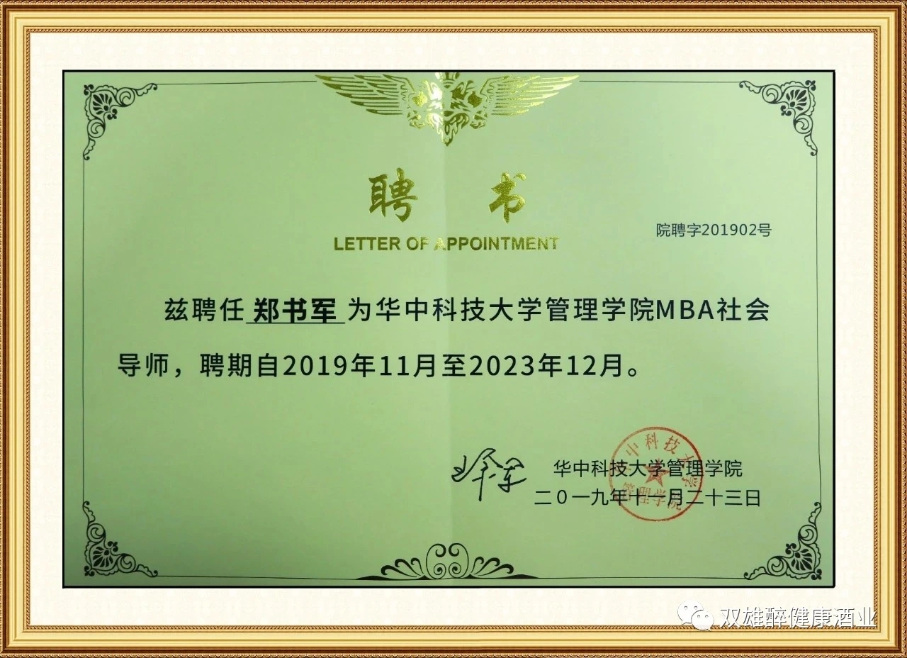 雙雄醉健康酒業(yè)總經(jīng)理鄭書軍,2019年底,被華科大管理學(xué)院聘為MBA社會導(dǎo)師,并頒發(fā)聘書。在華科大平臺上,分享實戰(zhàn)經(jīng)驗,為學(xué)生在協(xié)助職業(yè)生涯規(guī)劃等方面做指導(dǎo),傳承企業(yè)家精神,并為學(xué)子提供平臺,成長歷練,大家一起共建、共生、共享。
