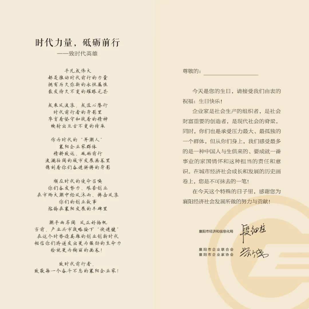 襄陽市企業(yè)聯(lián)合會常務(wù)副會長兼秘書長趙樂成向湖北東方化工有限公司黨委副書記、總經(jīng)理劉保新贈送由市經(jīng)信局段細柱局長、市企聯(lián)吳少偉會長簽名的《襄陽英雄 青春永駐》的生日賀卡