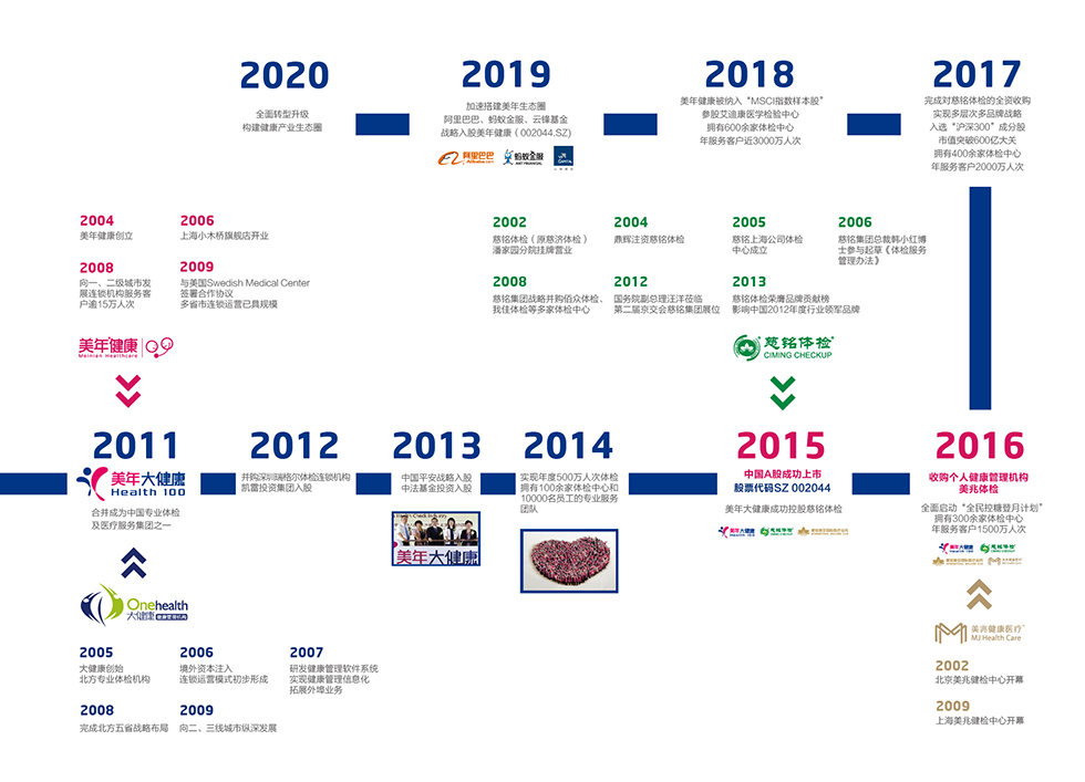 美年大健康產(chǎn)業(yè)控股股份有限公司始創(chuàng)于2004年,是中國規(guī)模和影響力顯著的健康體檢與醫(yī)療集團,總部位于上海。于2018年正式完成中國內(nèi)地版圖的全覆蓋。截至2020年年底,美年健康擁有由行業(yè)專家、醫(yī)技護人員等近35,000人組成的的專業(yè)服務(wù)團隊,近五年來累計已為超過1.1億人次提供專業(yè)健康服務(wù)。