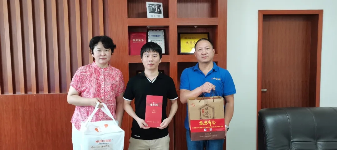 8月16日,在襄陽企聯(lián)常務副會長兼秘書長趙樂成帶領下,數(shù)據(jù)部部長劉輝、雙雄醉健康酒業(yè)大客戶服務部總監(jiān)李愛軍,來到湖北回天新材料股份有限公司,為湖北基地總經理張亞、集團副總韓林贈送盛滿了關愛的愛心蛋糕、賀卡以及雙雄醉頂級酒——清罇優(yōu)醬。