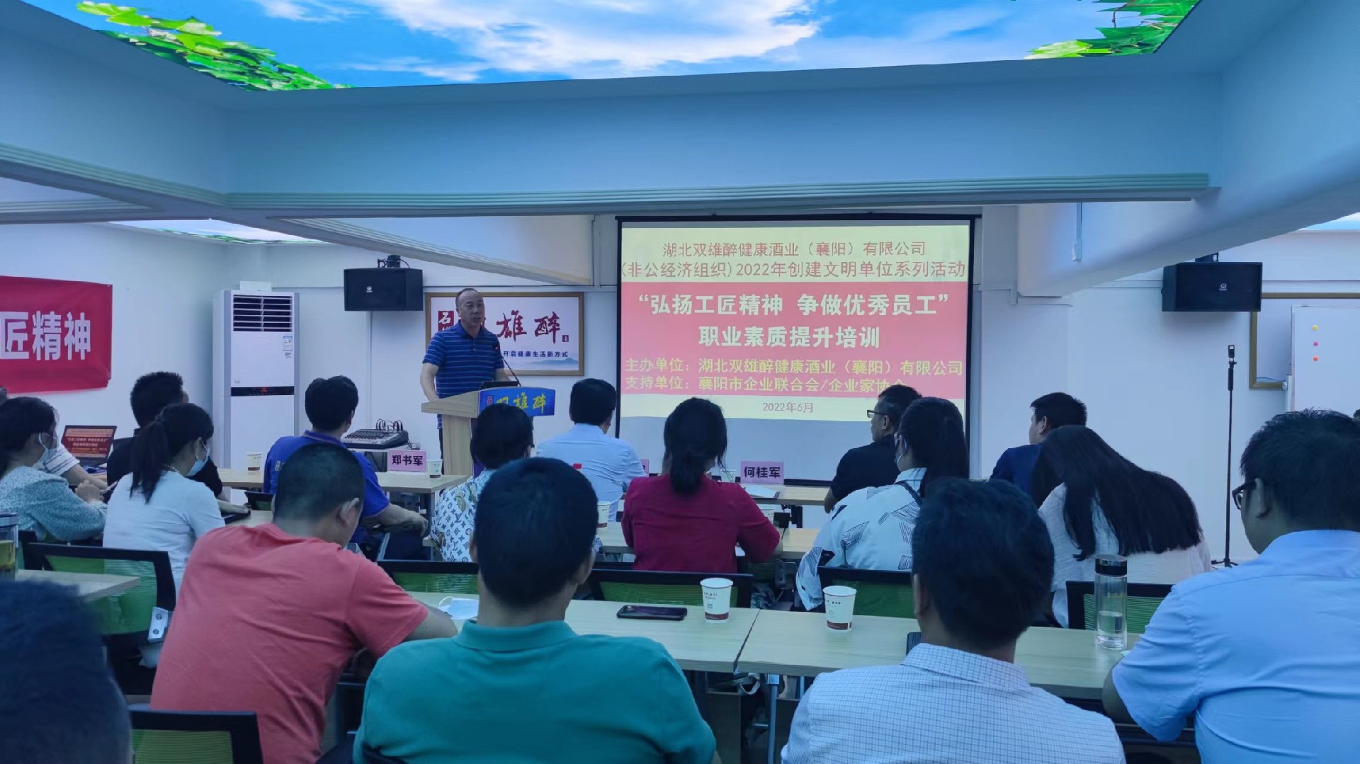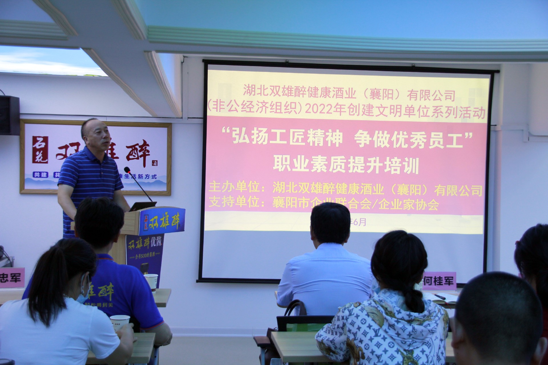 6月15日,由襄陽市精神文明建設(shè)辦公室、襄陽市經(jīng)濟(jì)和信息化局指導(dǎo)、襄陽市企業(yè)聯(lián)合會(huì)/企業(yè)家協(xié)會(huì)支持,湖北雙雄醉健康酒業(yè)有限公司主辦的“弘揚(yáng)工匠精神 爭(zhēng)做優(yōu)秀員工”職業(yè)素質(zhì)提升培訓(xùn)在雙雄醉健康酒業(yè)營(yíng)銷總部二樓會(huì)議室舉行。市委宣傳部文明創(chuàng)建一科科長(zhǎng)何桂軍、市經(jīng)信局機(jī)關(guān)黨委專職副書記田志強(qiáng)、市企聯(lián)常務(wù)副秘書長(zhǎng)申文寶等領(lǐng)導(dǎo)出席本次會(huì)議,會(huì)議由雙雄醉健康酒業(yè)總經(jīng)理鄭書軍主持。