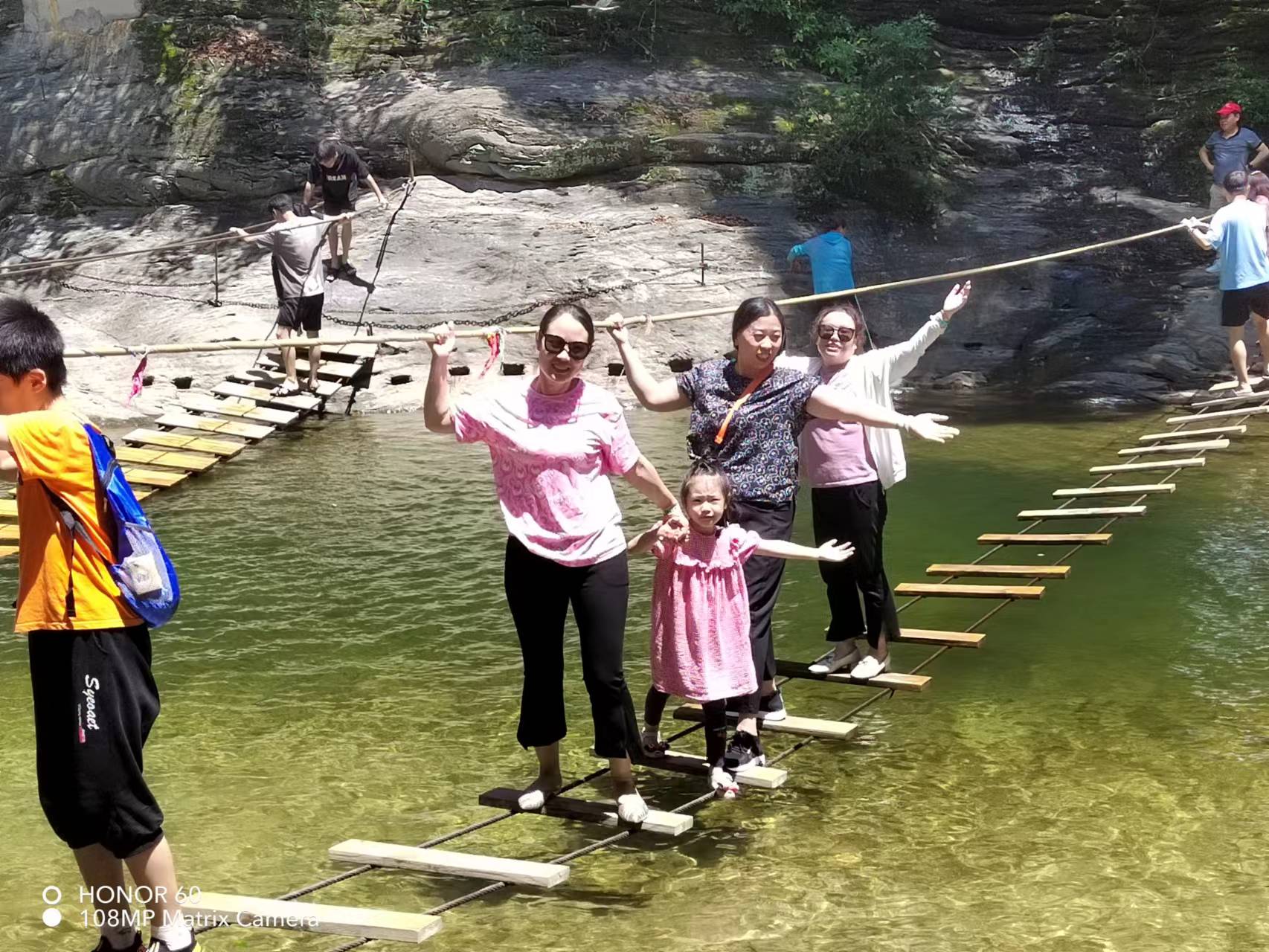 大家置身于山青水秀的班河大峽谷中,無不贊嘆大自然的鬼斧神工。步步驚心、彩虹吊橋、水上秋千、彩虹鋼絲橋、漂浮船、竹筏橋等水上項(xiàng)目讓人心驚膽戰(zhàn)而又躍躍欲試。